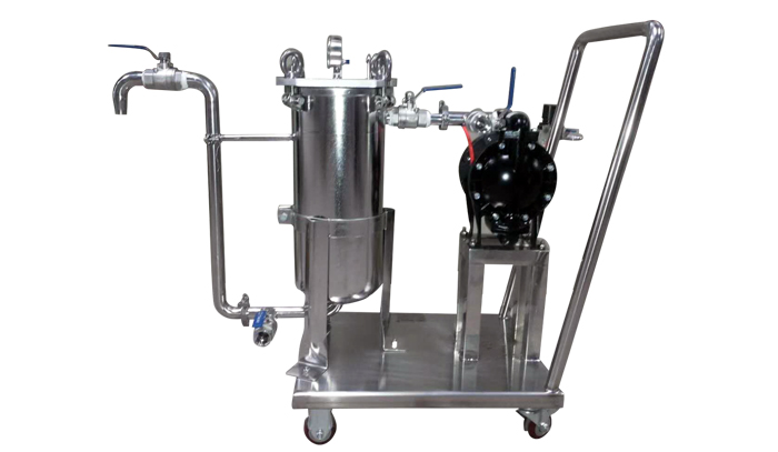 該機有設計成單過濾機,雙聯過濾機并可配套輸送泵組裝在移動式推車上。過濾機濾袋保護網均為不銹鋼制作,其余部件有碳鋼和不銹鋼制作兩種,供過濾不同介質的用戶選擇。